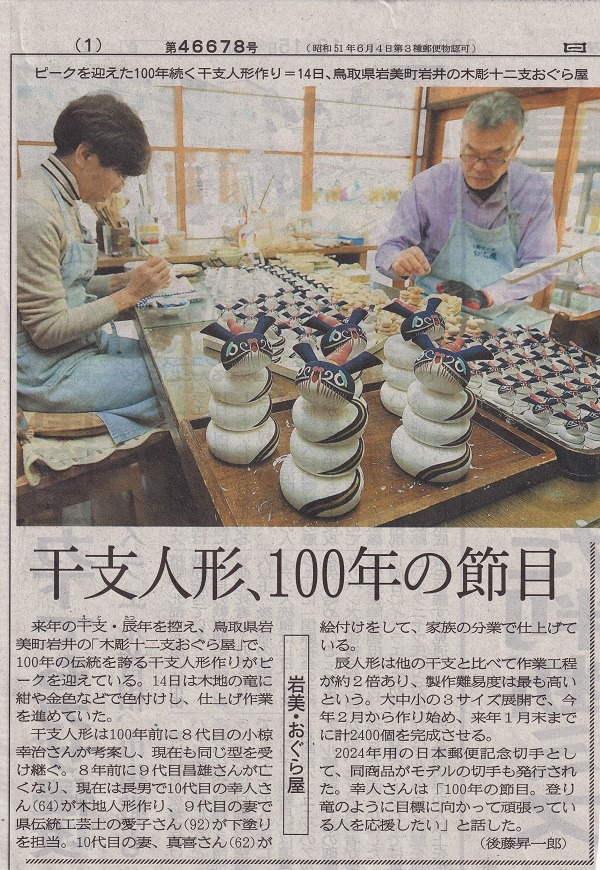 12月15日日本海新聞(1)面に「干支人形、100年の節目」の記事が載りました。例年は、師走スケッチ欄に掲載されてましたが、今年は100年の節目ということで、新聞社が大きく扱ってくださいました。伝統を守ることの大切さとご愛顧いただいた方々への感謝の気持ちでいっぱいになります。