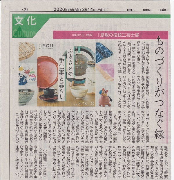 「ものづくりがつなぐ縁」日本海新聞に、陶芸家牛ノ戸焼小林遼司さんによる県伝統工芸士展を紹介する文章が載せられました。いよいよ明日18日から23日まで鳥取駅前「丸由百貨店」で開催されます。春を感じるこの時期に、たくさんの方と郷土工芸をとおして、ふれあいと出会いがあり、作り手としてはとても有意義な展示会です。機会があれば、是非立ち寄っていただければ幸いです。